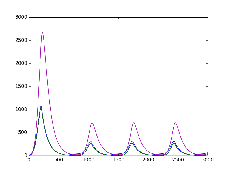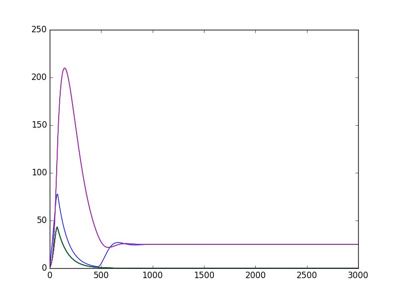 This is the solution without inhibitory-inhibitory connections. The Purple are inhibitory rates, the Blue is the cell with the highest input and Green